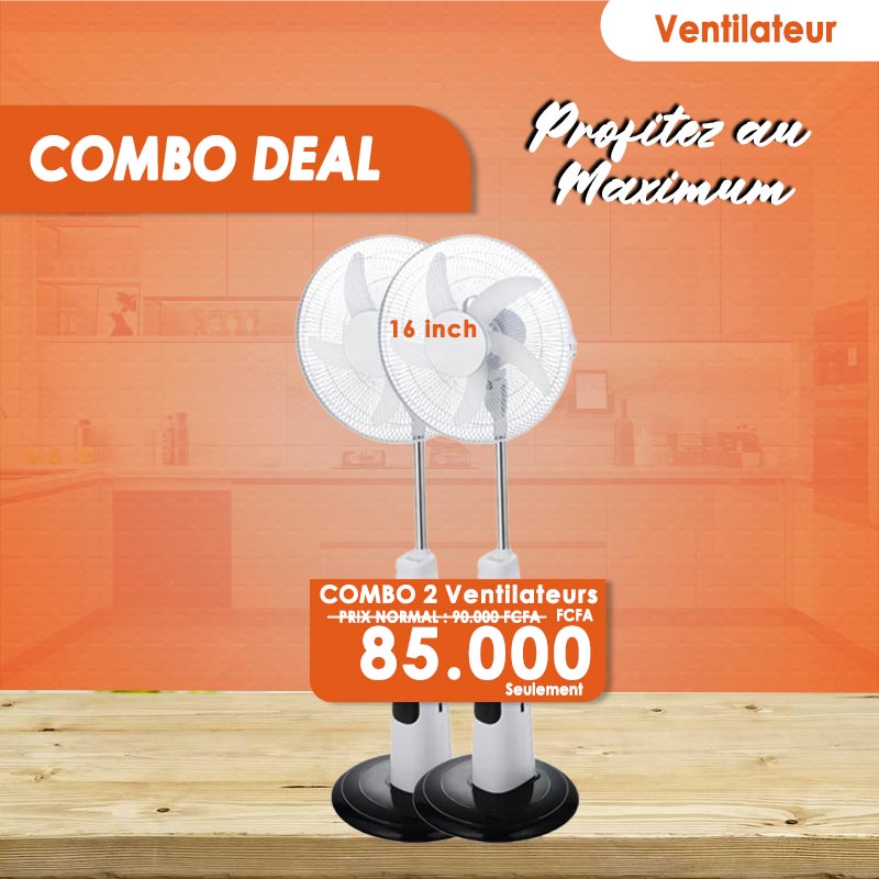Avec le Kit Combo Deal de Sodishop, plus vous achetez et plus vous économisez. Associez-vous à un collège, ami ou frère pour acheter à plusieurs à petit prix. L’offre comprend un ventilateur rechargeable multifonction 16 pouces, de très bonne autonomie.Et Oui ! Sur Sodishop, faites des économies sur nos offres spéciales.