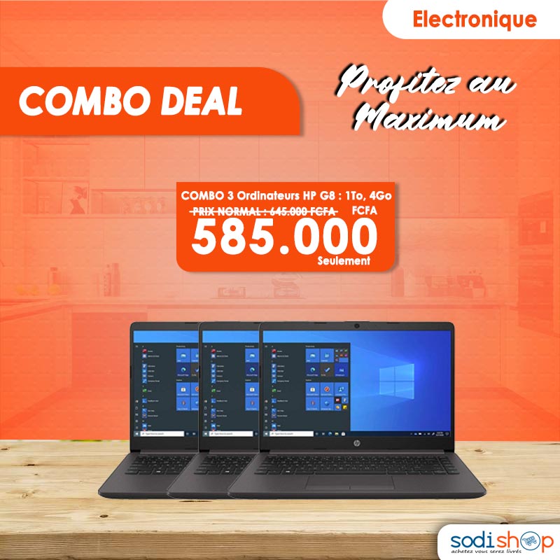 Avec le Kit Combo Deal de Sodishop, plus vous achetez et plus vous économisez. Associez-vous à un collège, ami ou frère pour acheter à plusieurs, à petit prix. L’offre comprend trois ordinateurs portables HP G8 de 1 Téra et 4 Go de Ram.Et Oui ! Sur Sodishop, faites des économies sur nos offres spéciales.